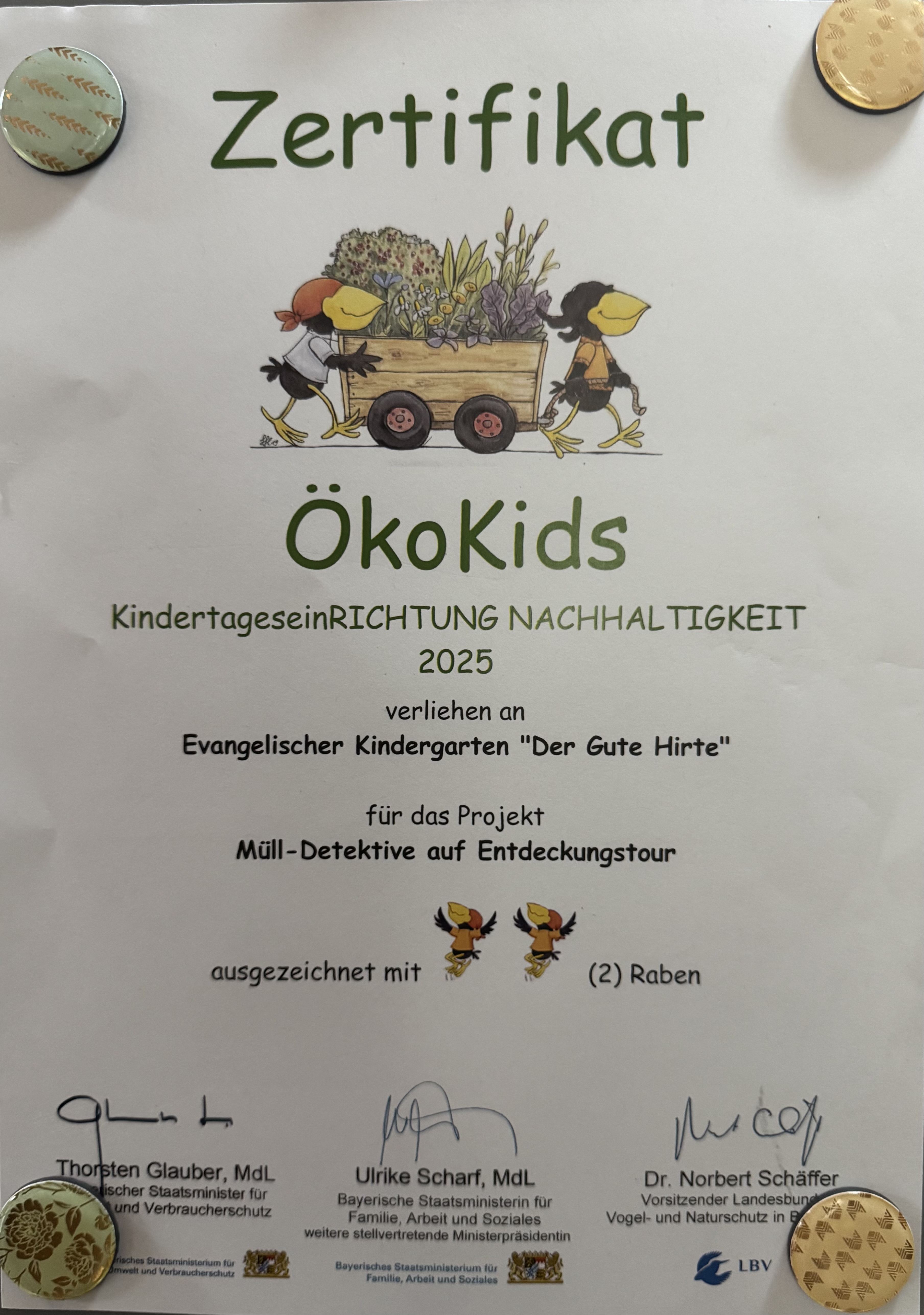 Hurra! Es hat geklappt. Unsere Bewerbung hat den Kriterien standgehalten und wir sind nun ÖkoKids! Am Montag, den 24.11.2025 fand nun endlich die Auszeichnungsveranstaltung statt und wir durften die Urkunde und das Aushängeschild von dem Umweltminister Herrn Thorsten Glauber entgegennehmen. Es war eine sehr schöne und feierliche Veranstaltung.